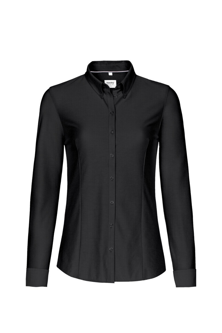 Modische, langärmelige Bluse mit Button-Down-Kragen, leichter Taillierung durch Abnäher am Rückenteil, leicht gerundetem Saum, weitenverstellbaren Manschetten, modischer Paspel aus dunkelblauem Satin an der inneren Kragennaht, hochwertig verarbeitete Knopfleiste, doppelte Schulterpasse, 4-Loch-Knöpfen - über Kreuz vernäht und doppelt verknotet für extrafesten Halt -, Ersatzknöpfen, und Doppelkappnaht an den Seitennähten. Bluse mit Wiener Naht im Vorderteil. Hergestellt aus angenehm weicher und bügelleichter Jaquard- Maschenware aus einer strapazierfähigen Baumwoll-Polyester Mischung. Durch eine spezielle Stricktechnik wird eine natürliche Elastizität für einen ultimativen Tragekomfort erzeugt. Gewebtes HAKRO-Necklabel aus hochwertigem Kettsatin mit weichen, ultraschallgeschnittenen Bandkanten für höchsten Tragekomfort.